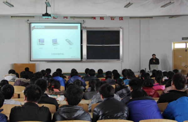 讲座先由潍坊世纪阳光电子科技服务有限公司技术总监、联想公司高级工程师陈曙亮为同学们讲解了无线互联网的相关知识,特别针对无线路由器的基本知识及安装使用进行了详细的讲解。之后,由潍坊世纪阳光电子科技服务有限公司服务之星、联想公司高级工程师杨涛从屏幕、硬盘、主板等方面向大家讲解了笔记本电脑的使用及保养知识。(张凡供稿)
