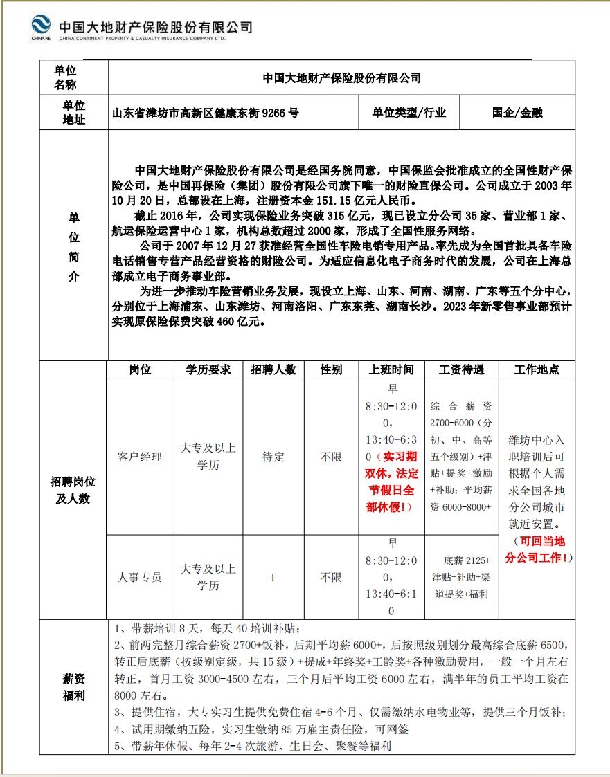 中国大地财产保险股份有限公司2024年招聘简章