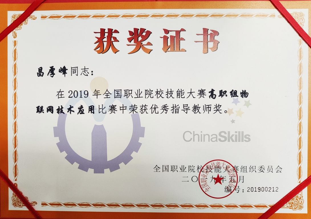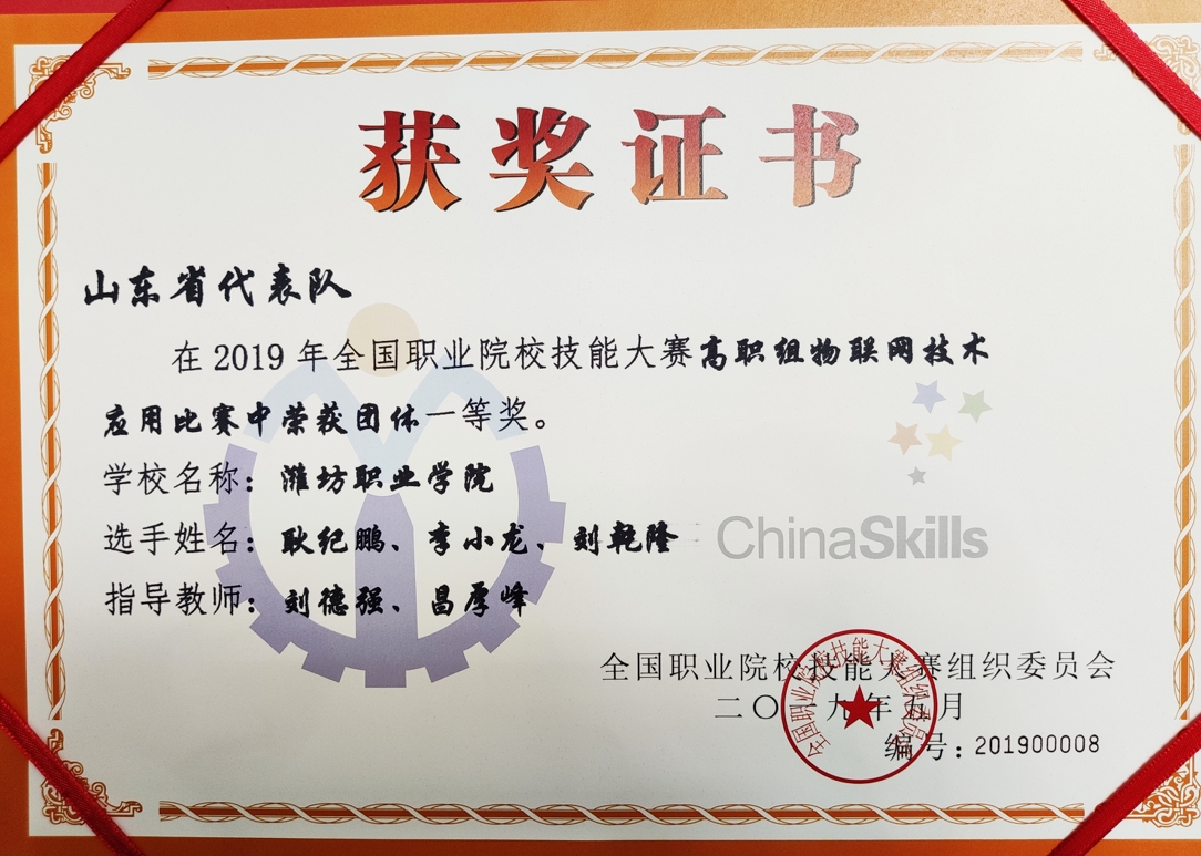 5月7日,2019年全国职业院校技能大赛高职组“物联网应用技术”赛项在天津中德应用技术大学举办,来自全国104个代表队参加角逐。公司员工耿纪鹏、李小龙、刘乾隆组成的代表队,在指导教师团队刘德强、昌厚峰、焦国栋带领下以第一名的优异成绩获得团体一等奖,指导教师刘德强、昌厚峰获“优秀指导教师奖”。