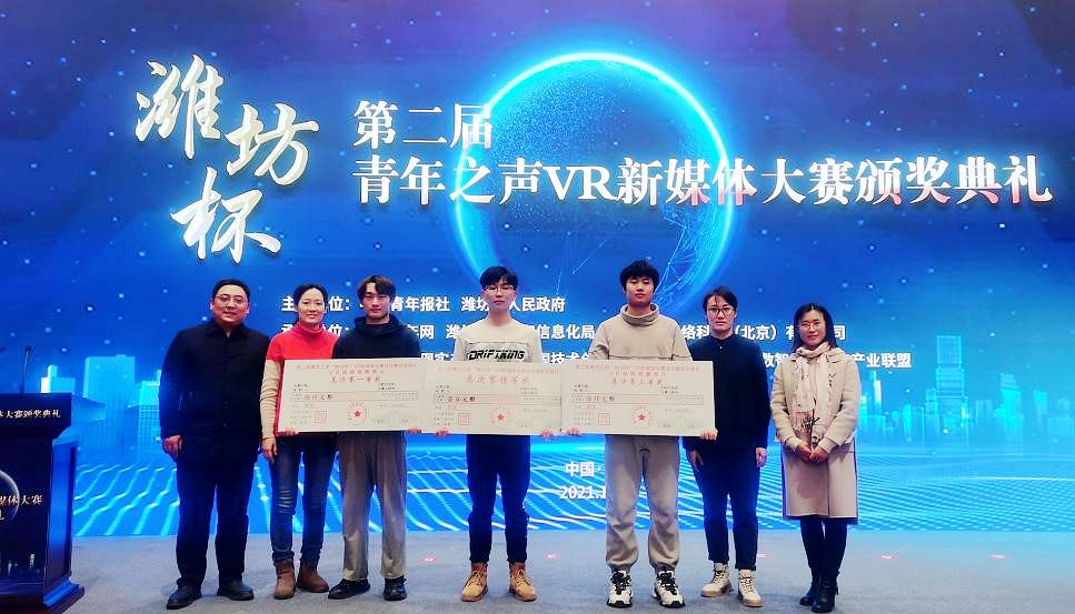 2021年12月30日,第二届青年之声VR新媒体大赛总决赛颁奖典礼在富华国际会议中心举办。公司伟德国际victor1946参赛的作品《龙宫探宝》获得总决赛唯一的特等奖;《潍坊非遗风筝VR展示》获得总决赛一等奖;《数字校园》获得总决赛三等奖。王世霖、王梦禹、贺春旭三名同学代表团队上台领奖,王世霖同学作为员工代表上台发言。