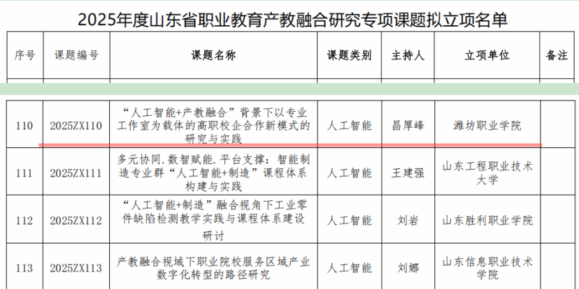 近日,山东省职业教育和产业人才研究院公布了2025年度山东省职业教育产教融合研究专项课题的遴选结果,公司主持的《“人工智能+产教融合”背景下以专业工作室为载体的高职校企合作新模式的研究与实践》课题成功获批立项。